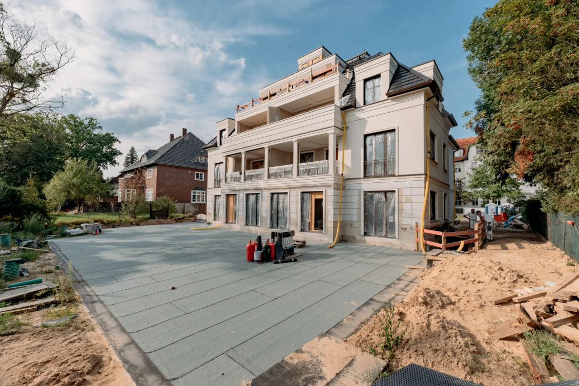 Der hintere seitliche Lichthof wurde betoniert und ausgeschalt. Gleichzeitig erfolgte der Erdaushub für den straßenseitigen Lichthof, wodurch die letzten Bereiche der Außenstruktur sichtbar werden. Im Innenausbau schreiten die Fliesenarbeiten weiter voran – Akzentfliesen in ausgewählten Bädern setzen dabei besondere gestalterische Highlights.