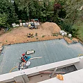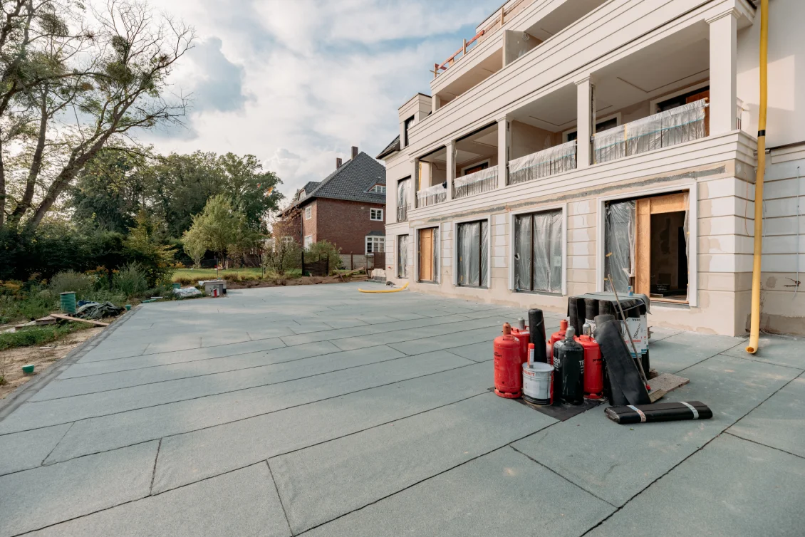 Die Tiefgaragendecke wurde zum Großteil abgedichtet und sorgt somit für einen dauerhaften Schutz vor Feuchtigkeit. Die ersten Absturzsicherungen an der Loggia im Obergeschoss wurden montiert, während im inneren des Hauses die vorbereitenden Maßnahmen für die Fliesen- und Malerarbeiten laufen.