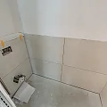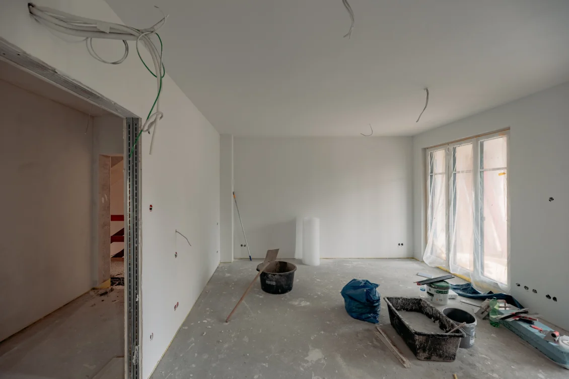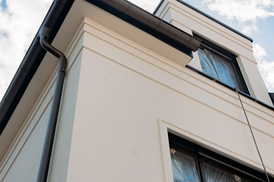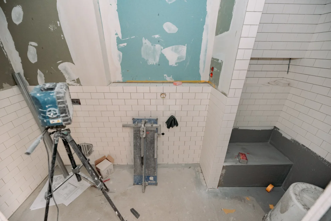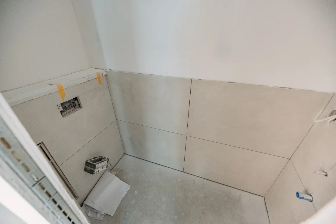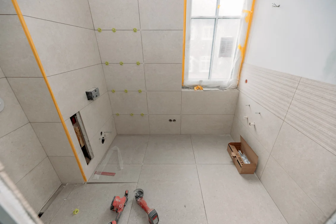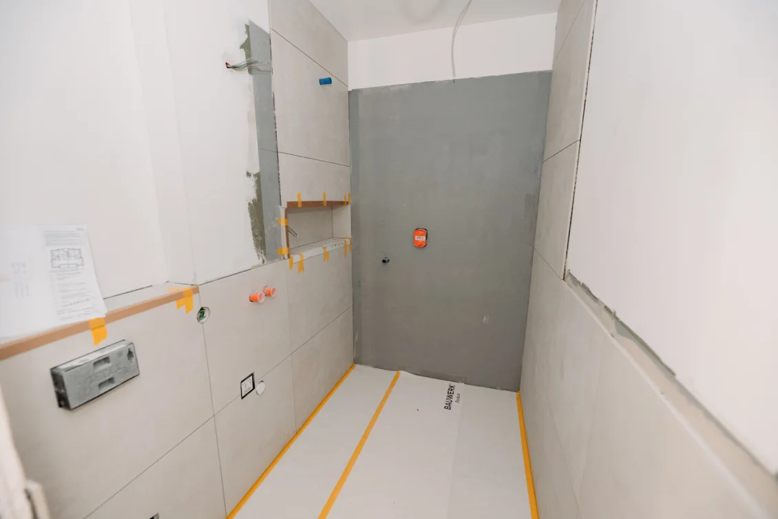 An der Fassade sind nun die Fallrohre montiert, wodurch das äußere Erscheinungsbild weiter an Klarheit und Struktur gewinnt. Im Innenbereich ist der Estrich in allen Räumen fertiggestellt und bildet die Grundlage für die kommenden Bodenarbeiten. Parallel dazu haben die Fliesenarbeiten begonnen, die dem Ausbau Schritt für Schritt sichtbare Gestalt verleihen.