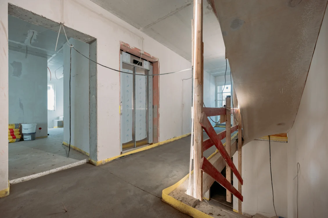 Die ersten Natursteintreppenbeläge im Treppenhaus wurden verlegt und verleihen den Räumen ein hochwertiges, langlebiges Finish. Die Herstellung der Aufzugsauskleidung ist in Arbeit und sorgt für ein funktionales wie ästhetisches Innenleben des Aufzugs. Die gelieferten Innentüren stehen bereit und können in Kürze montiert werden, wodurch die Raumaufteilung endgültig sichtbar wird.
