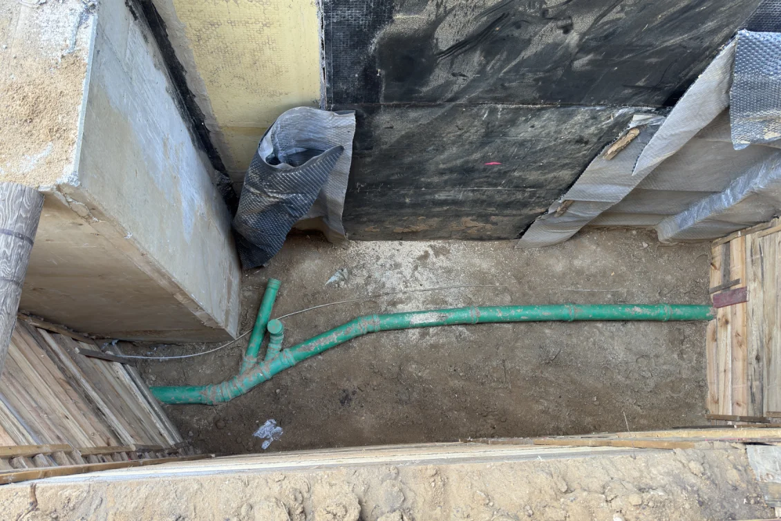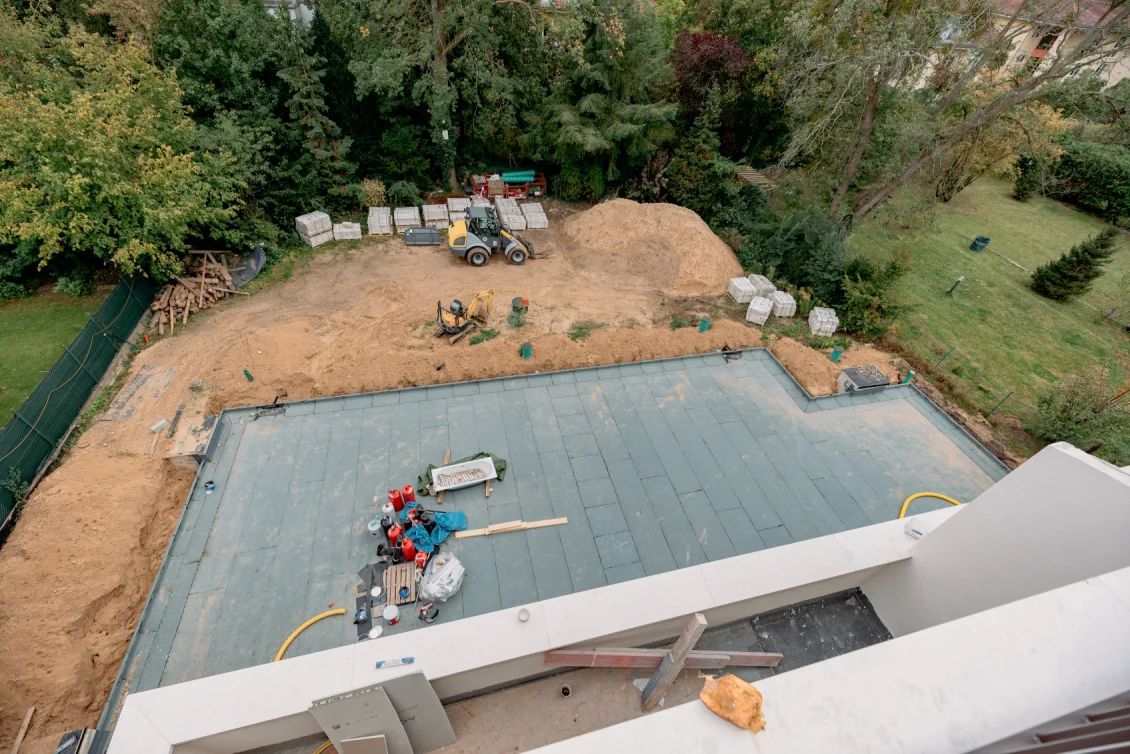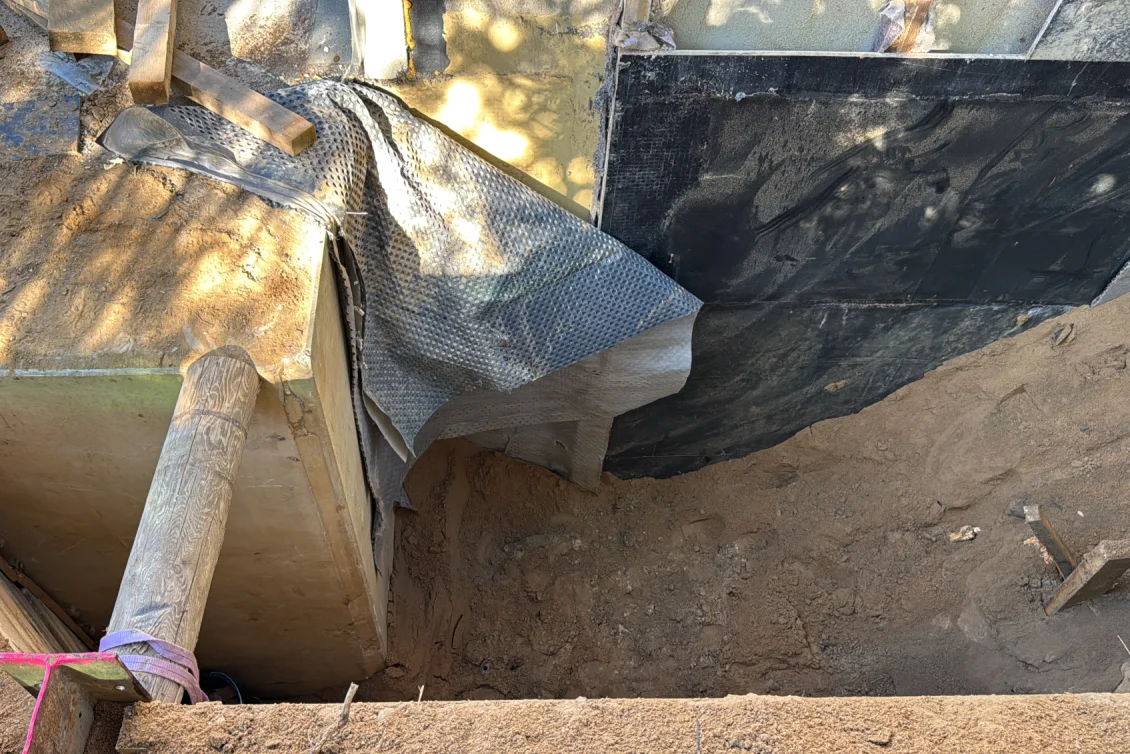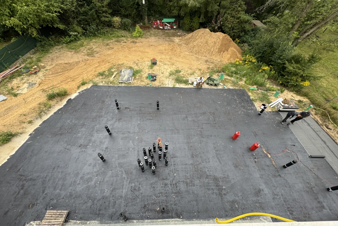 Die Lichthöfe sind nun klar erkennbar und geben dem Baukörper erste räumliche Konturen. Parallel dazu laufen die Abdichtungsarbeiten an der Tiefgarage: Die Flächen werden mit Bitumenbahnen versehen und sorgfältig verschweißt, um einen dauerhaften Schutz gegen Feuchtigkeit zu gewährleisten. Ergänzend werden Drainageleitungen eingebaut, die das anfallende Wasser sicher ableiten.