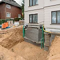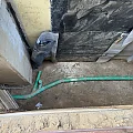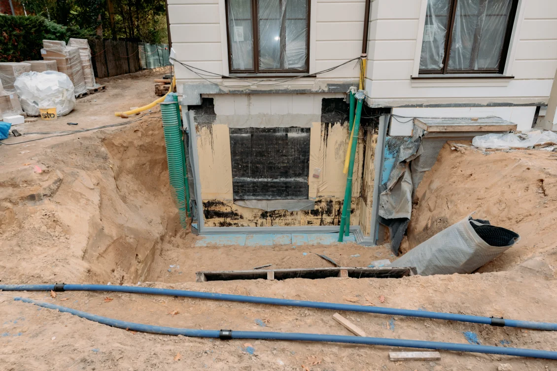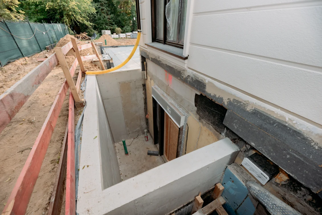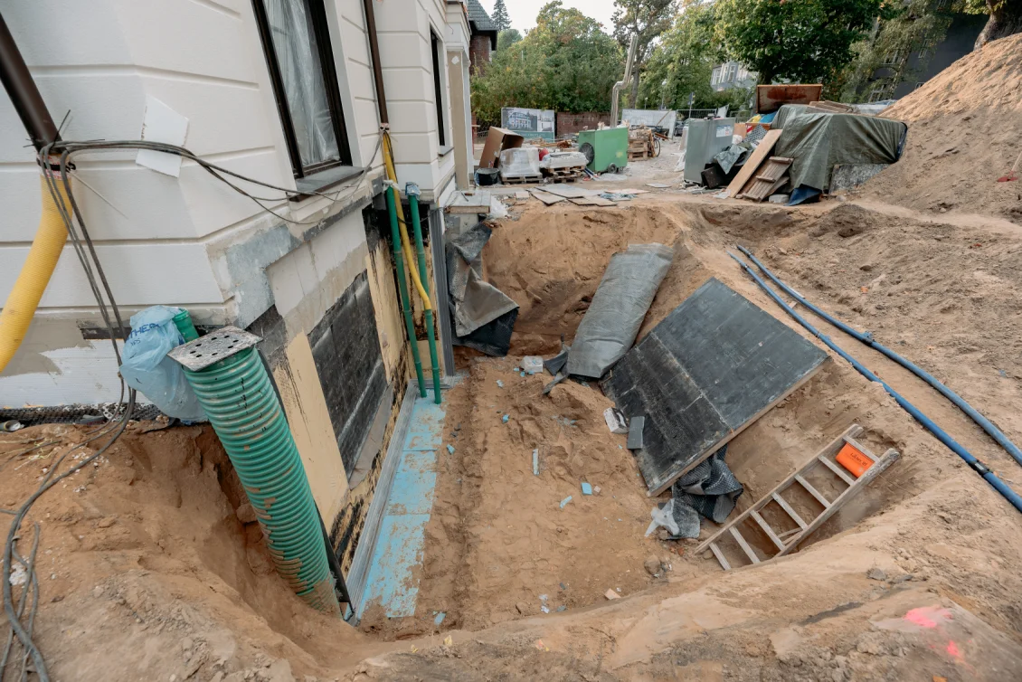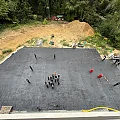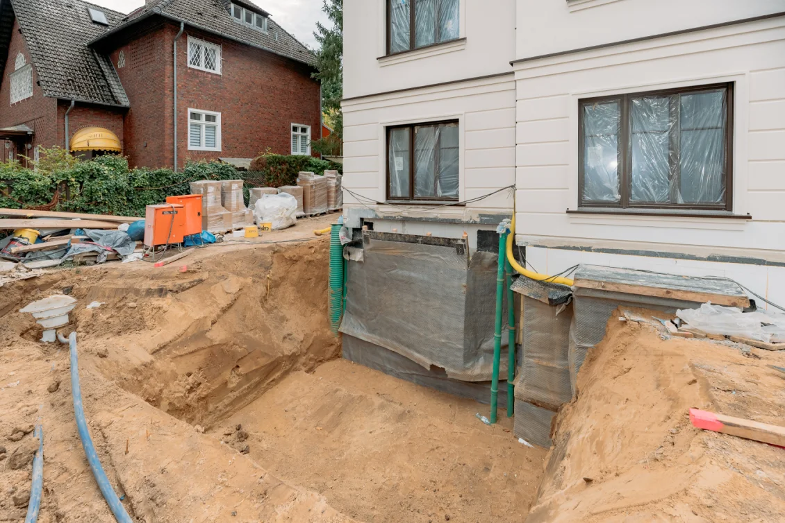 Die Lichthöfe sind nun klar erkennbar und geben dem Baukörper erste räumliche Konturen. Parallel dazu laufen die Abdichtungsarbeiten an der Tiefgarage: Die Flächen werden mit Bitumenbahnen versehen und sorgfältig verschweißt, um einen dauerhaften Schutz gegen Feuchtigkeit zu gewährleisten. Ergänzend werden Drainageleitungen eingebaut, die das anfallende Wasser sicher ableiten.