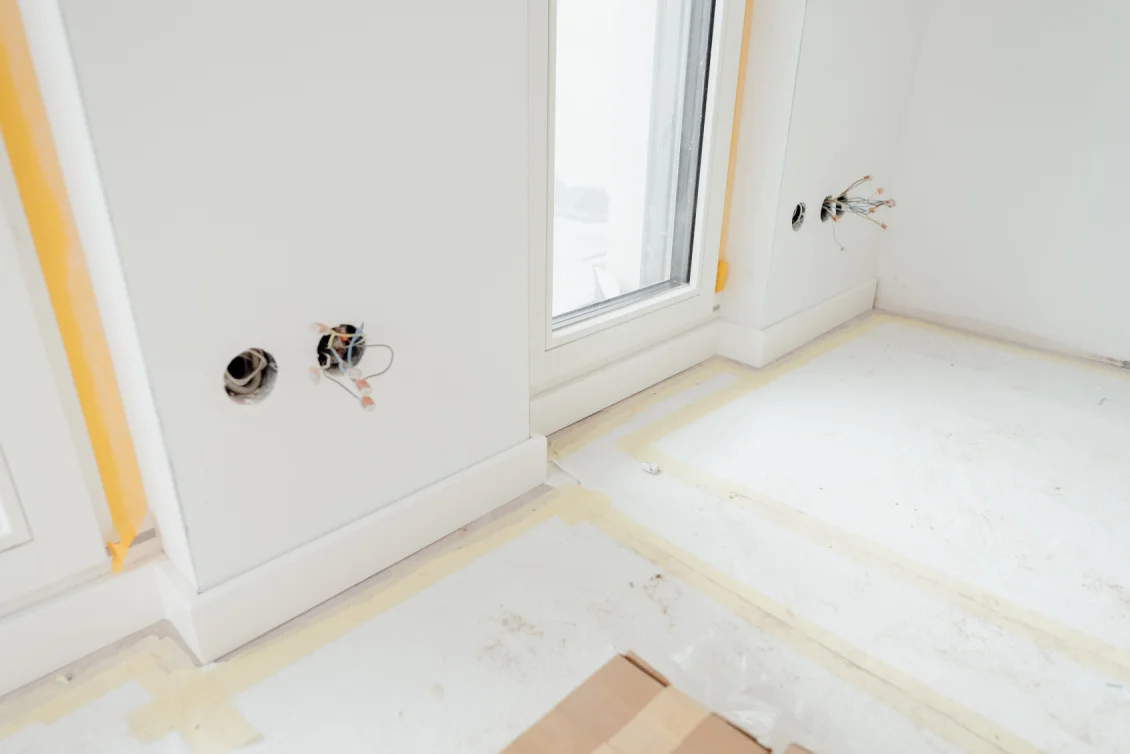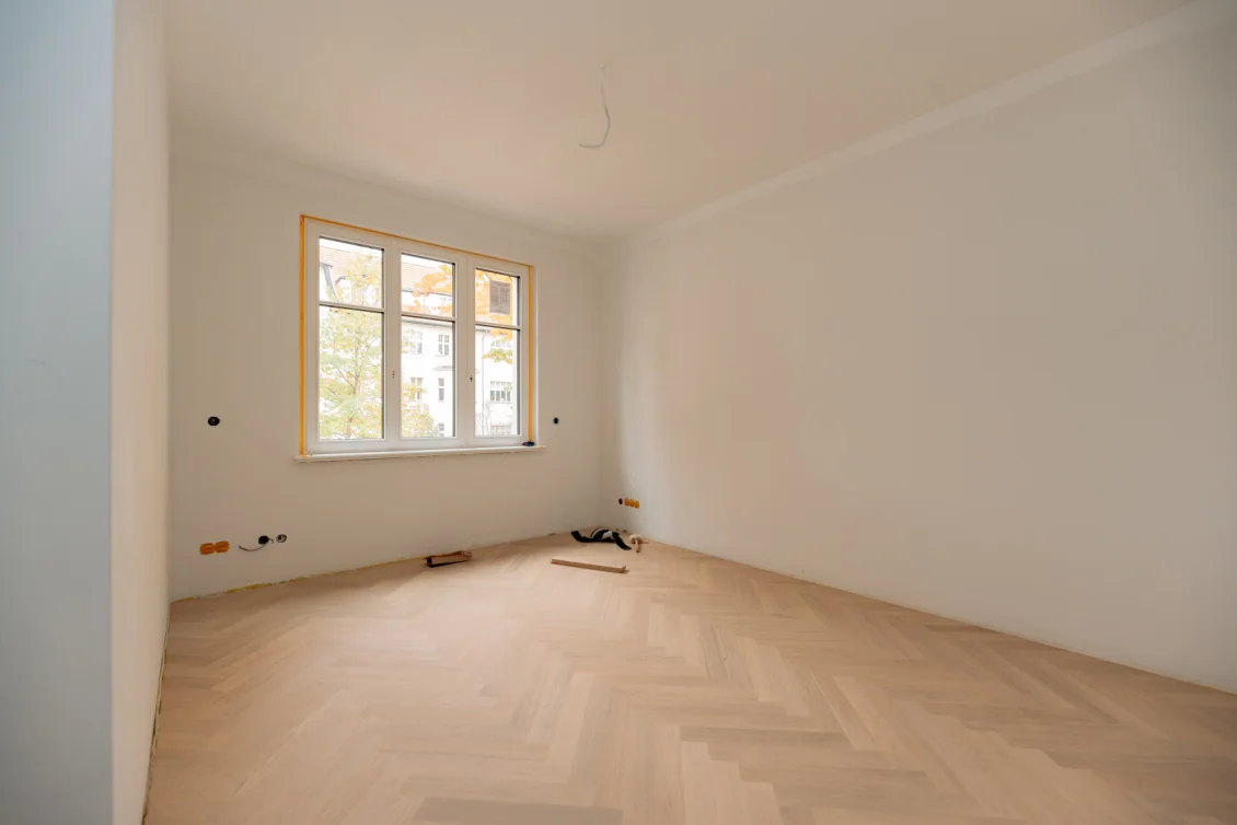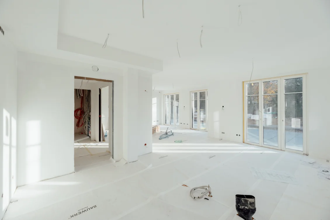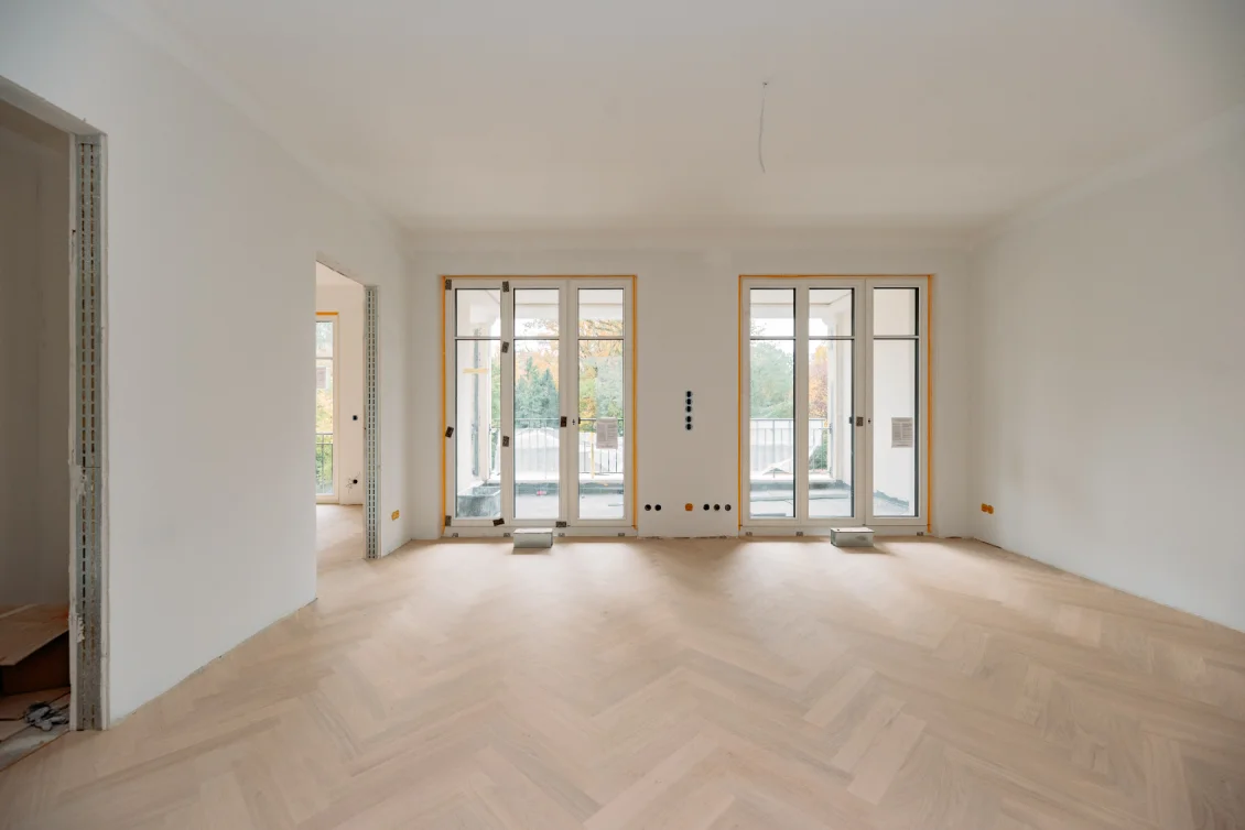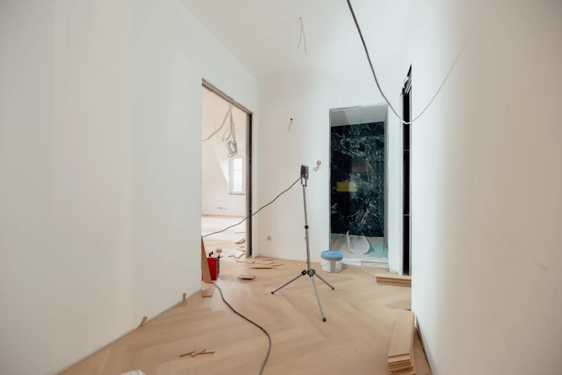 Das Rolltor der Tiefgarage wurde installiert – es fügt sich optisch stimmig ein und bietet gleichzeitig Sicherheit und Komfort. Die Arbeiten an Parkett- und Fliesenbelägen schreiten weiter voran, wodurch die Räume zunehmend ihr fertiges Erscheinungsbild erhalten. Zudem wurde die Unterkonstruktion für Schalter und Steckdosen fertiggestellt, die Grundlage für die abschließende Elektroinstallation.