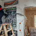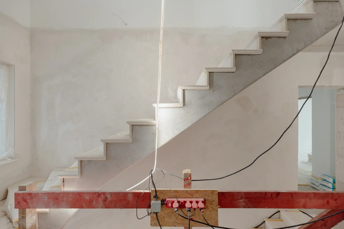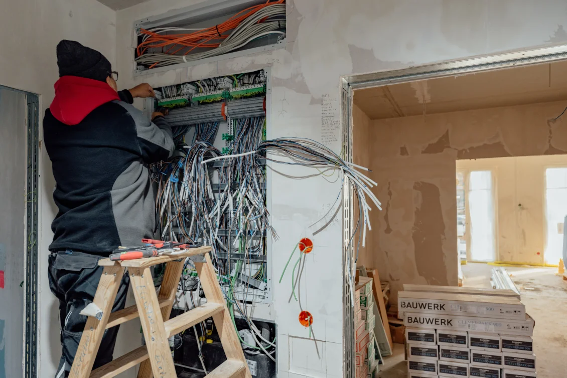Schritt für Schritt nimmt die Architektur Gestalt an: Der Stahlbetontreppenlauf erhält Tritt- und Setzstufen aus Vratza-Kalkstein – robust, hell und angenehm warm in der Haptik. Die Trockenbau-Schiebetüröffnung schafft fließende Übergänge zwischen Wohnen und Garten. Leitungen sind vorbereitet, Decken und Wände gespachtelt. Was heute noch nach „Kabelwald“ aussieht, ist die Schaltzentrale für Strom, Daten und Smart-Home-Funktionen. Jedes Kabel wird geprüft, beschriftet und sauber auf Reihenklemmen aufgelegt – so entstehen Sicherheit, Stabilität und Komfort auf Knopfdruck.