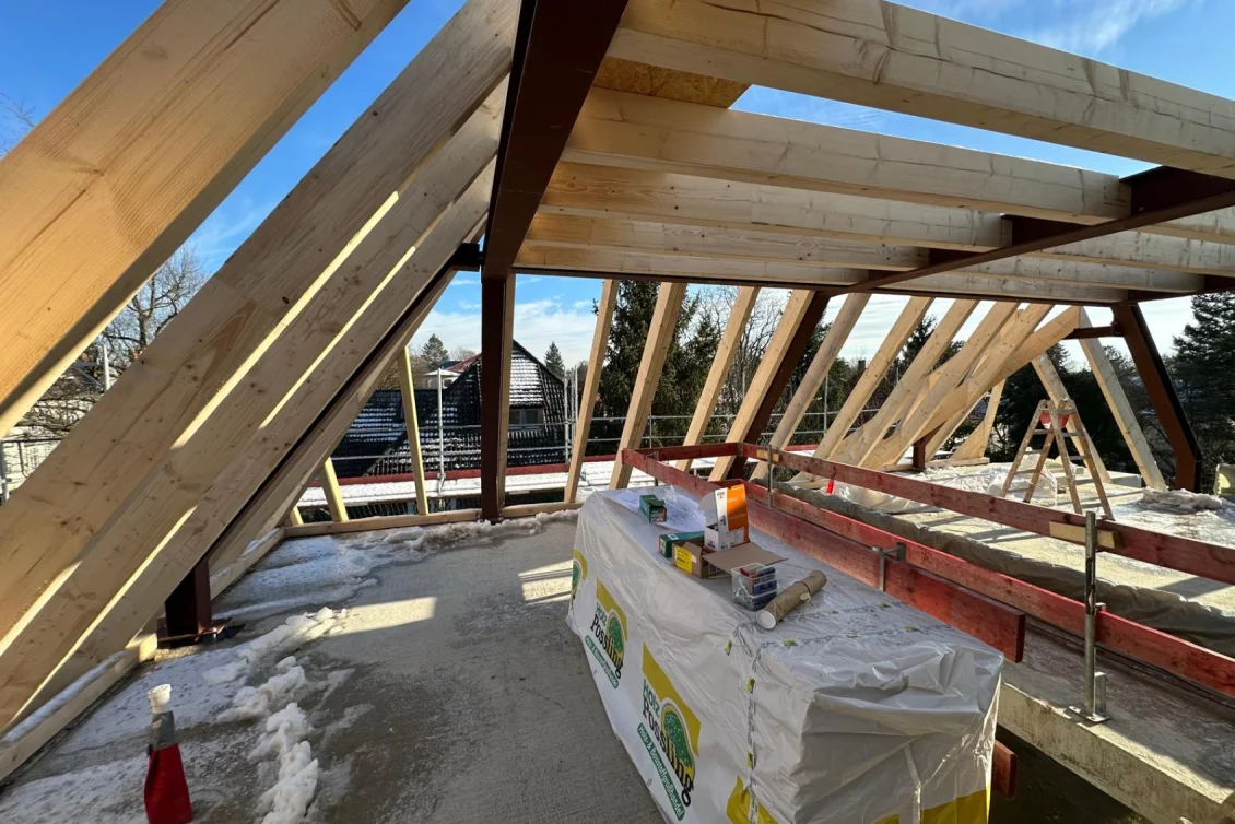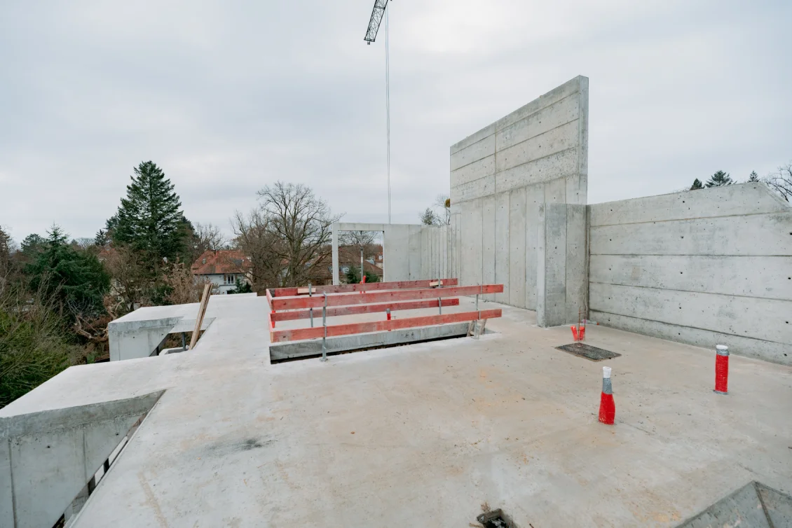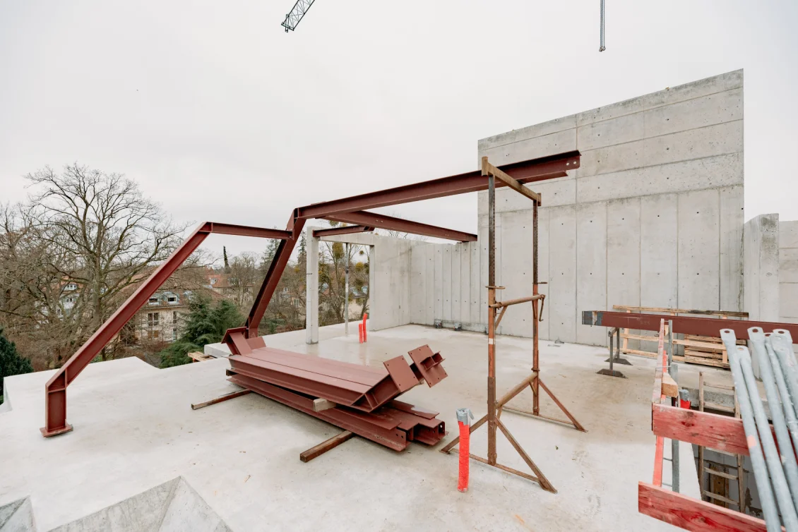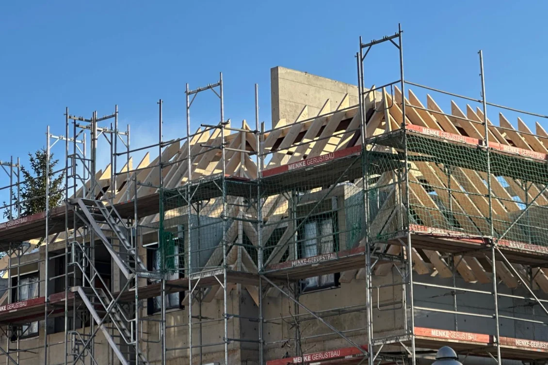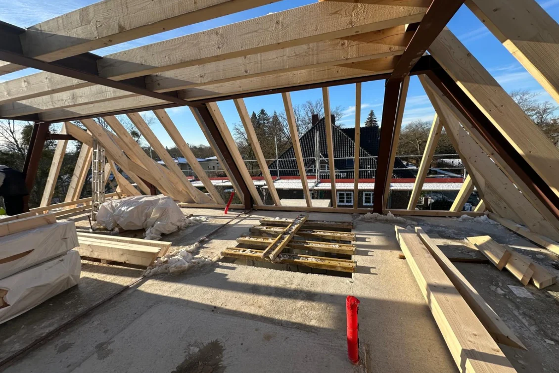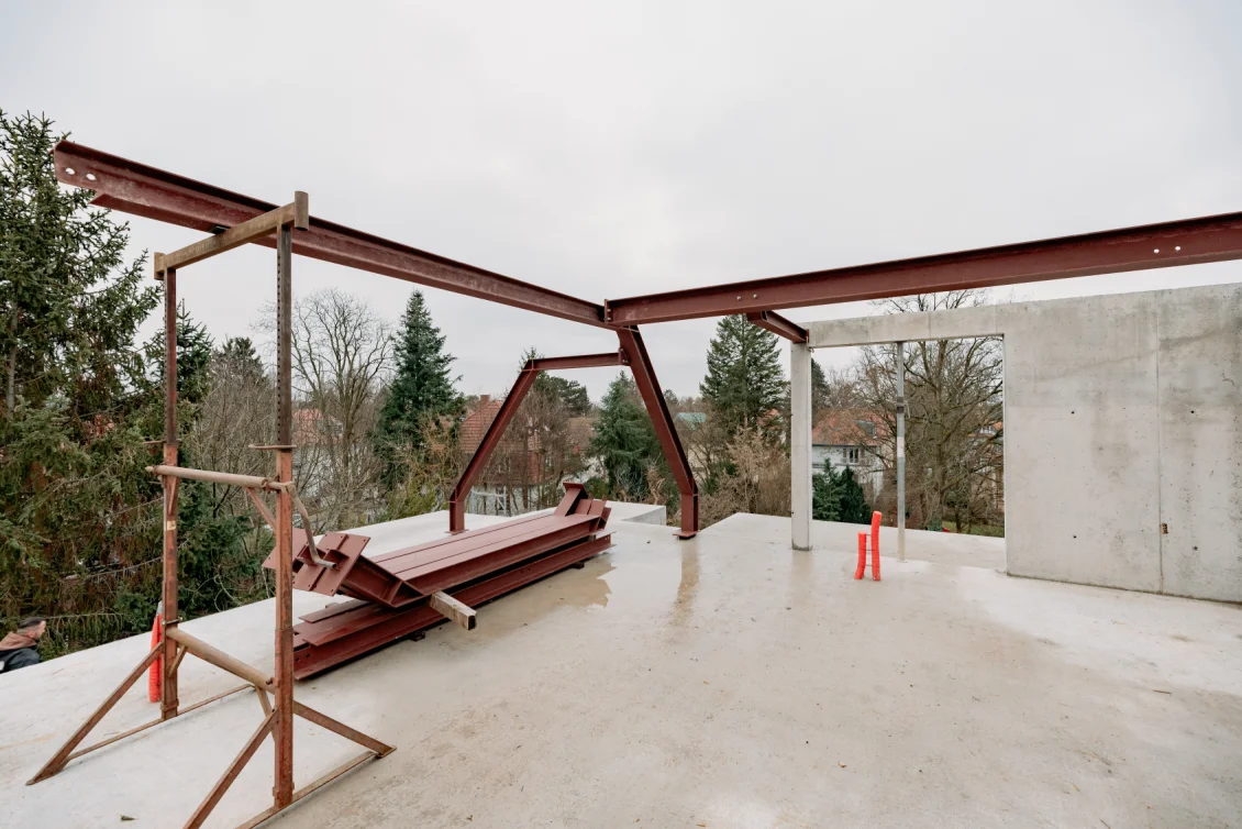 Die Stahlträger für den Dachaufbau und den Zugang zur Dachterrasse werden montiert. Der Charakter der oberen Etage wird immer deutlicher, und die Arbeiten markieren einen weiteren wichtigen Fortschritt. Trotz nasskalter Witterung rücken wir Schritt für Schritt näher an das nächste Ziel – ein Meilenstein in der Fertigstellung des Rohbaus!