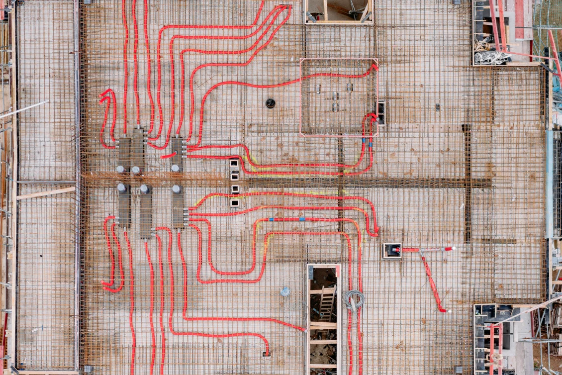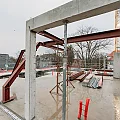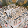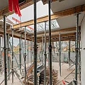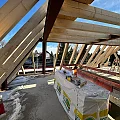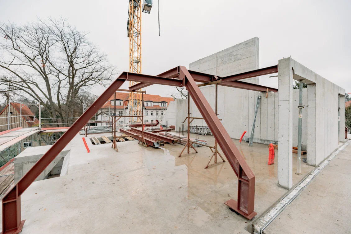 Sonnige Aussichten zum Jahresauftakt: Das Zusammenspiel von Stahl und Holz prägt das Erscheinungsbild der Baustelle. Die stabilen Stahlrahmen schaffen großzügige, stützenfreie Räume und dienen gleichzeitig als Tragwerk für den Holzdachstuhl vom Zimmermann. Technik und Handwerk greifen hier perfekt ineinander!