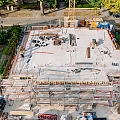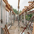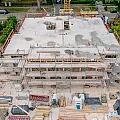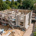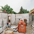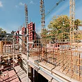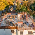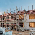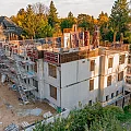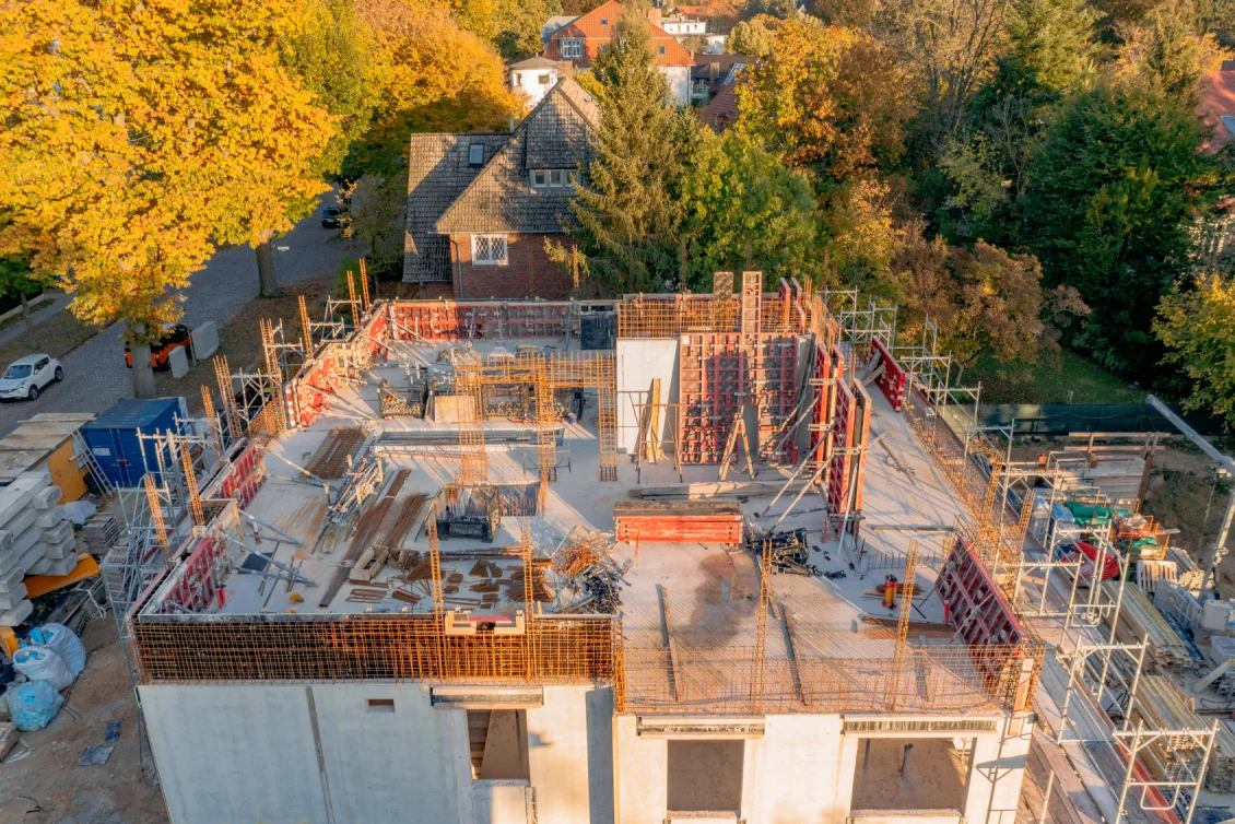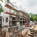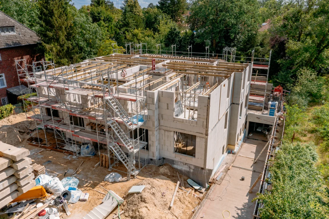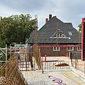 Der Aufbau des Fassadengerüsts beginnt in Teilen. Gleichzeitig werden die massiven Wände im Obergeschoss gestellt. Die Gartenseitigen Loggien sind bereits zu erkennen.