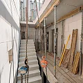 Mithilfe des Krans werden die ersten Treppenfertigteile ins Treppenhaus transportiert und befestigt. Inzwischen stehen alle Wände im Obergeschoss, sodass bereits die Vorbereitungen für die Decke darüber getroffen werden können.