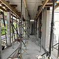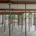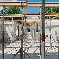 Die Drehsteifen und Schalungsträger stehen in Position, um die Filigrandecken über dem Obergeschoss aufzunehmen. Erneut kommt der Kran zum Einsatz, um sie an Ort und Stelle zu vertragen.
