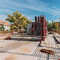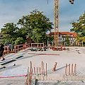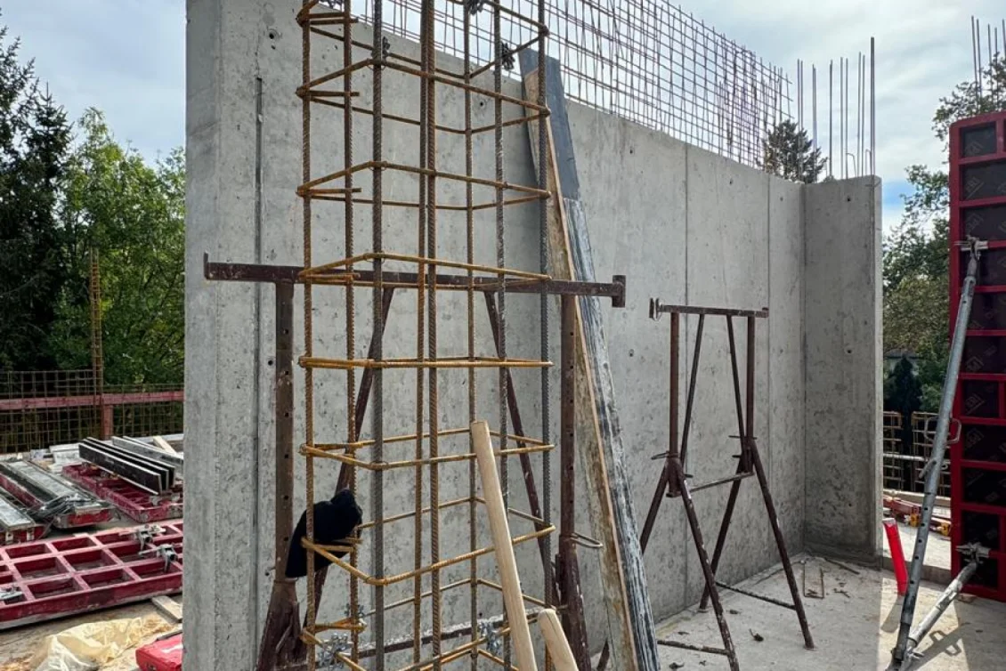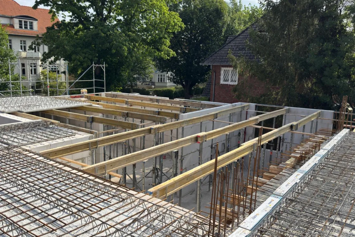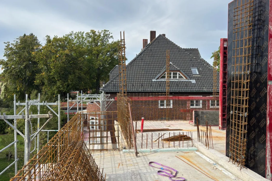 Die Arbeiten am Rohbau im Dachgeschoss werden fortgeführt. Aktuell werden die Bewehrungseisen für den Drempel hergestellt, über den später der Lastabtrag der Dachkonstruktion erfolgt.