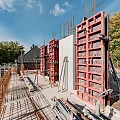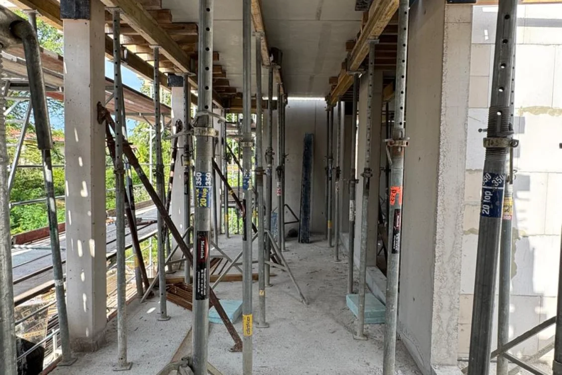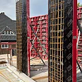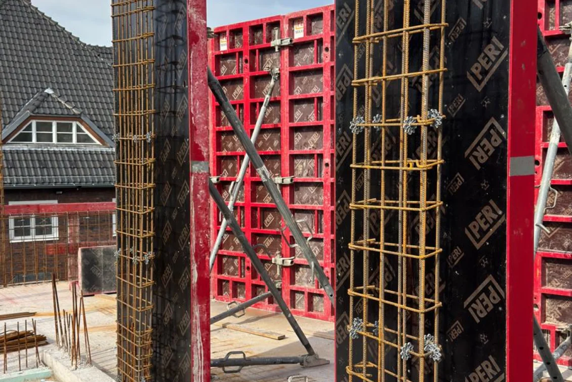 Im Dachgeschoss werden nun die Gauben- und Wohnungstrennwände mittels modularem Schalungssystem von PERI hergestellt. So wird ein reibungsloser Ablauf gesichert und die Stahlbetonwände erhalten eine besonders glatte Oberfläche.