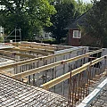 Die Bewährung der Gaubenwände wird nach und nach hergestellt und selbige Abschnittsweise betoniert. Die Errichtung der Gaubenwände ist auf Grund ihrer Form deutlich aufwändiger als die Herstellung der Drempel- und Brüstungswände und benötigt somit mehr Feinarbeit und Zeit.