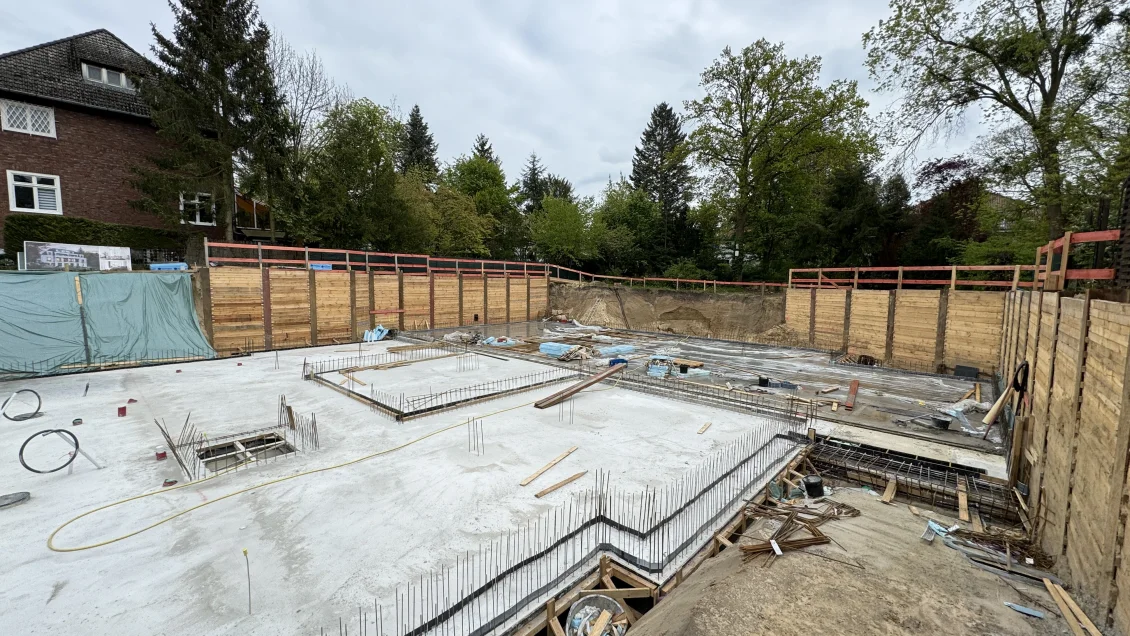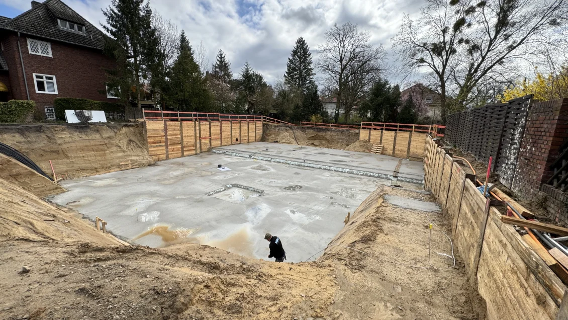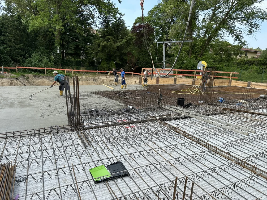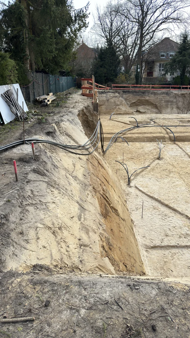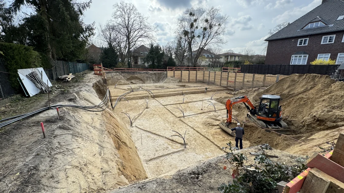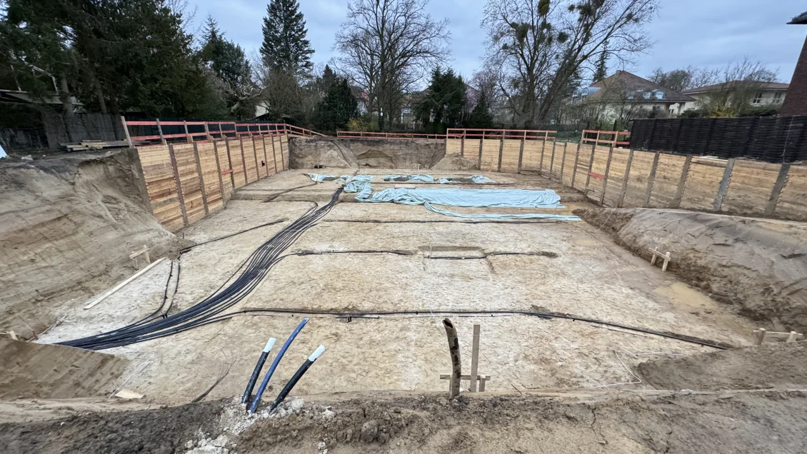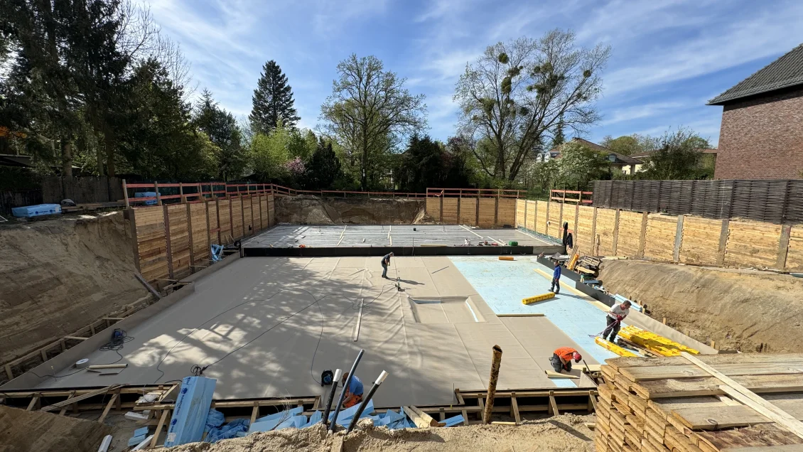 Nach Anbindung der Erdwärmesonden haben wir die Erdarbeiten abgeschlossen. Weiter geht es mit der Herstellung der Sauberkeitsschicht, der Basis für alle weiteren Bauprozesse. Zunächst werden die Stützenfundamente sorgfältig vorbereitet sodass anschließend betoniert werden kann.