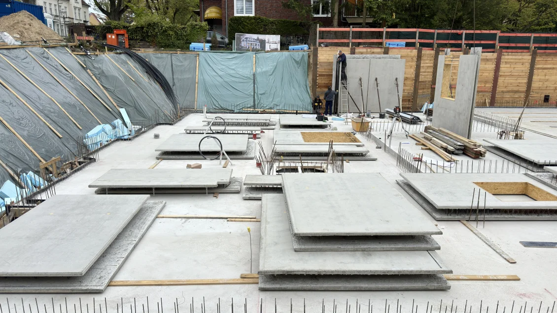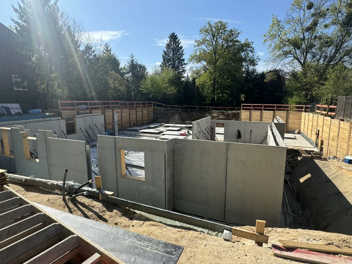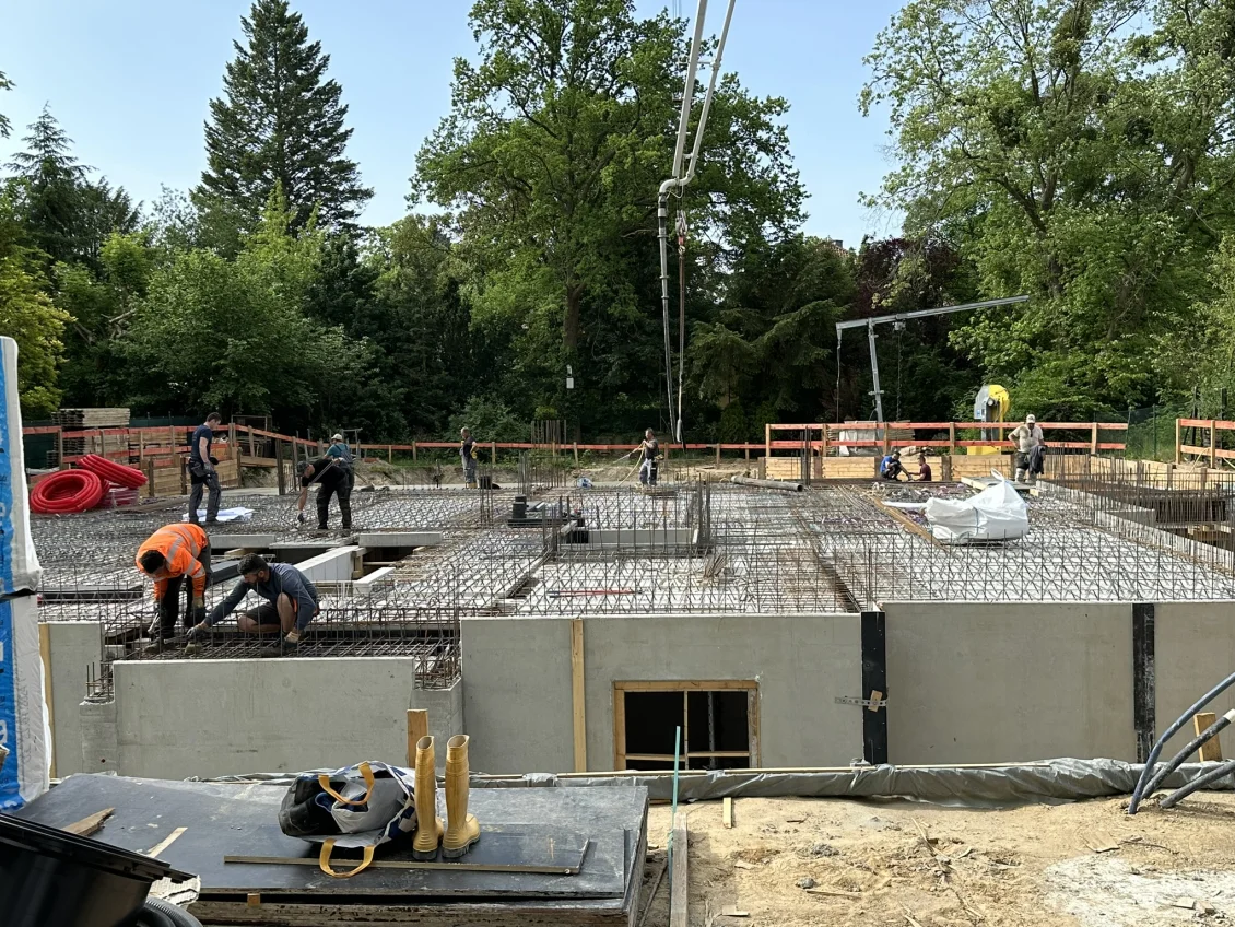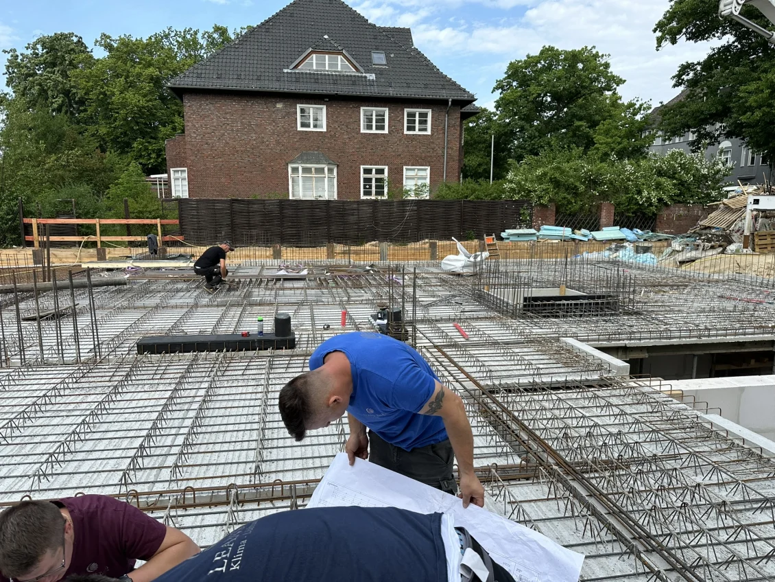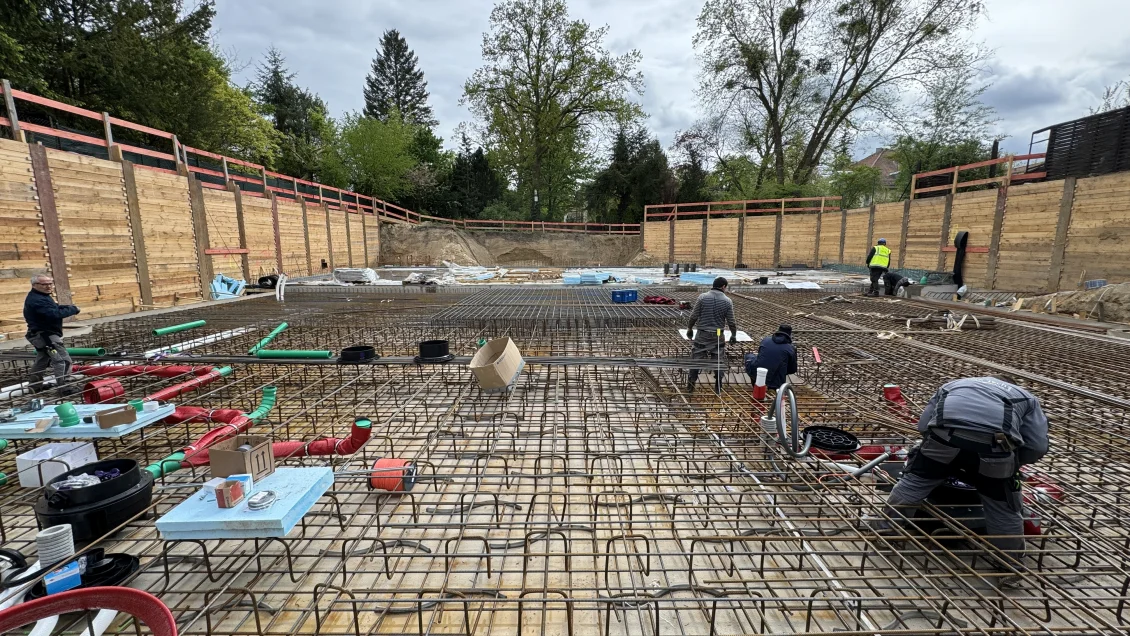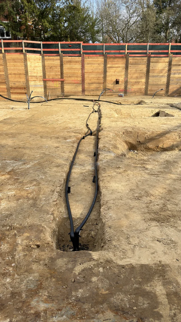 Nach Anbindung der Erdwärmesonden haben wir die Erdarbeiten abgeschlossen. Weiter geht es mit der Herstellung der Sauberkeitsschicht, der Basis für alle weiteren Bauprozesse. Zunächst werden die Stützenfundamente sorgfältig vorbereitet sodass anschließend betoniert werden kann.