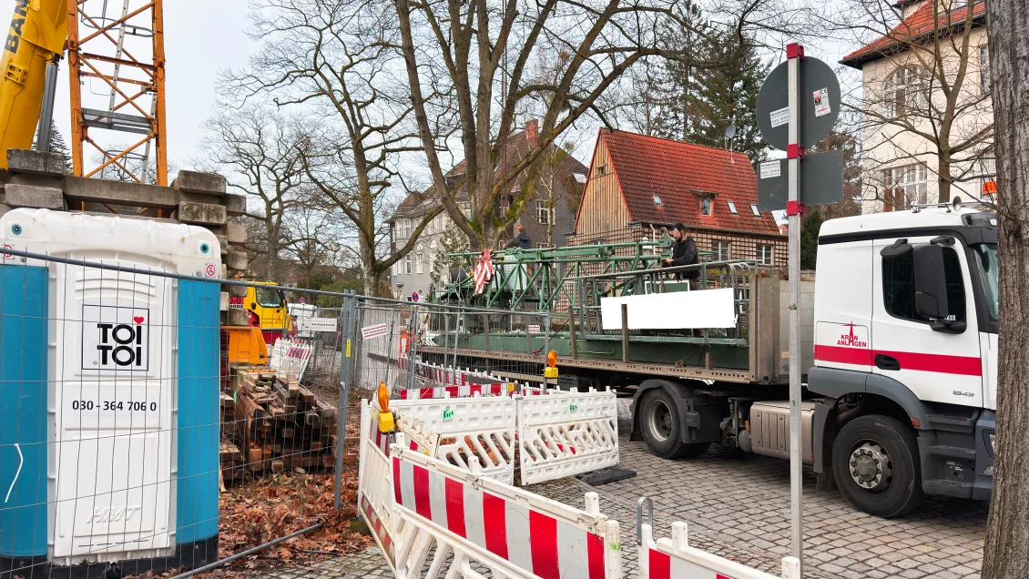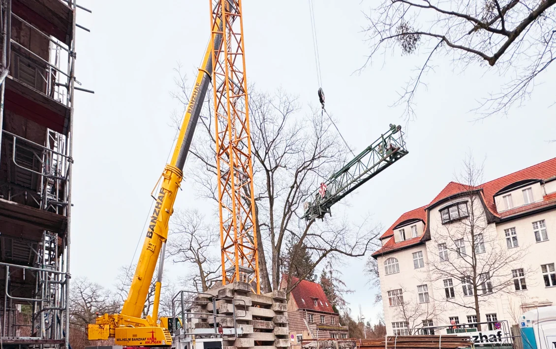 Mit der Fertigstellung des Dachstuhls und des gesamten Rohbaus ist der Einsatz des Krans nun nicht mehr erforderlich. Um den sicheren und reibungslosen Abbau zu gewährleisten, wurde eigens eine Straßensperrung eingerichtet.