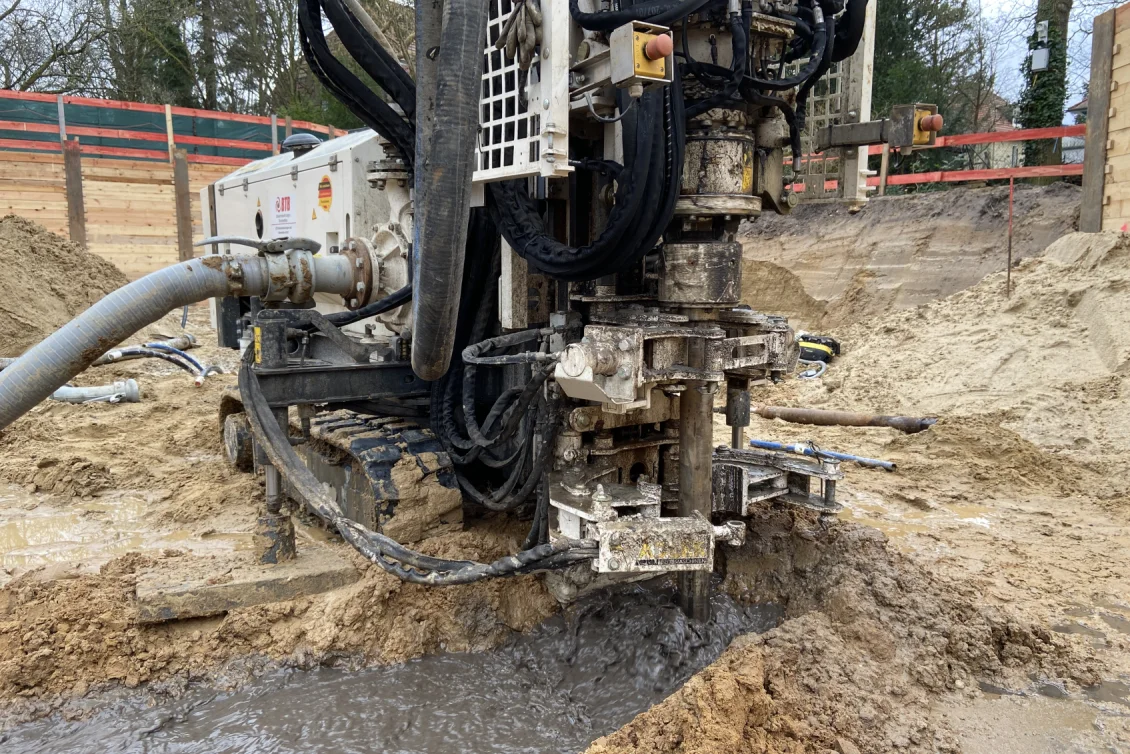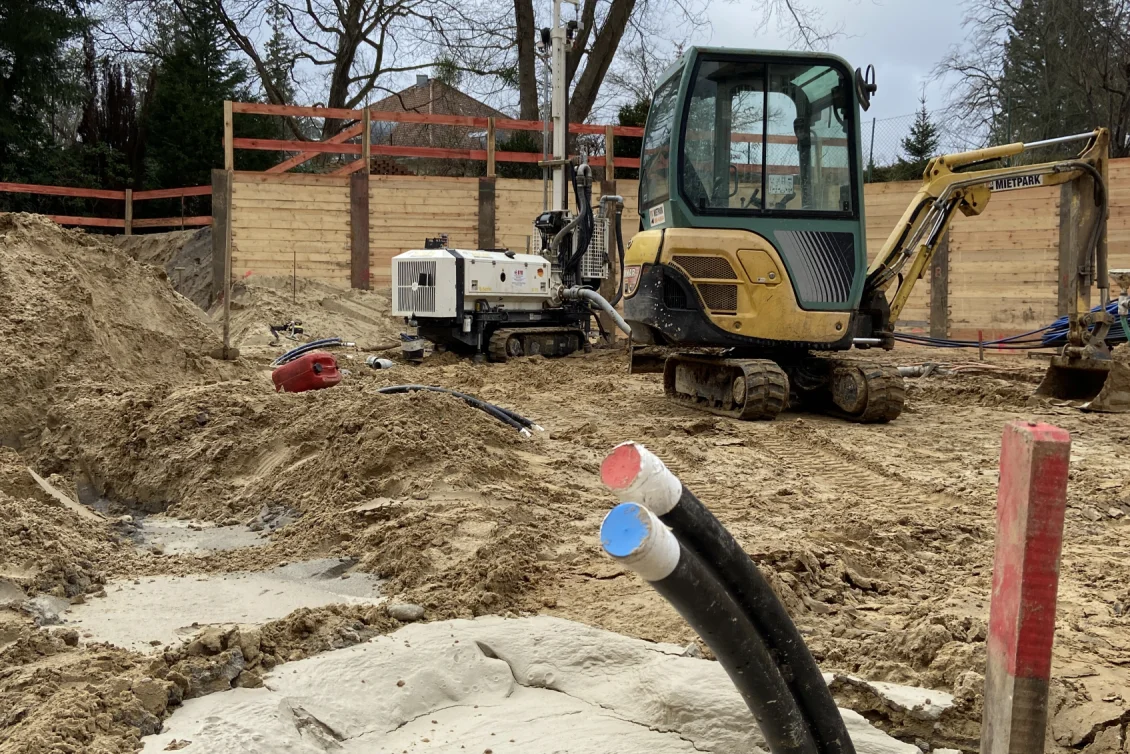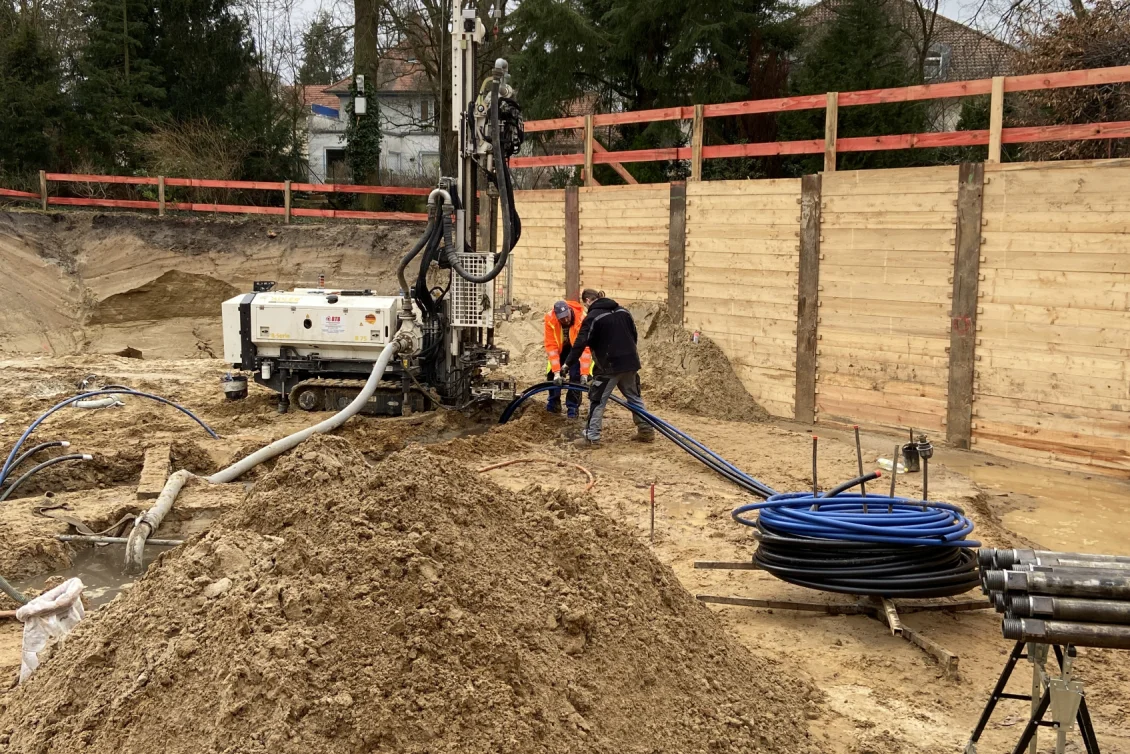 Um CO2-Emissionen zu reduzieren und eine nachhaltige Wärmegewinnung für unsere Wohnhäuser sicherzustellen, setzen wir Erdwärmepumpen ein. Bei 23 der 28 etwa 40 Meter tiefen Erdwärmebohrungen erfolgt die Platzierung unterhalb der Bodenplatte.