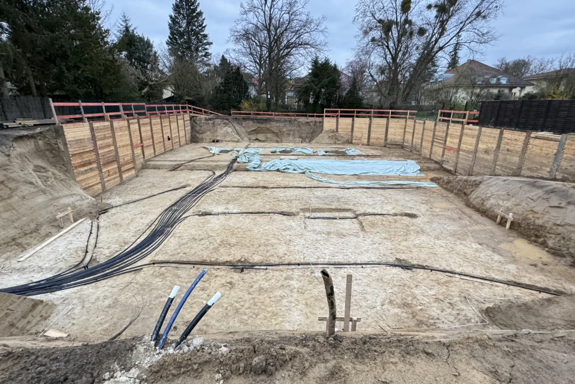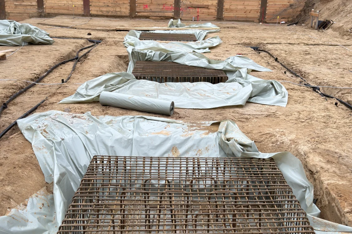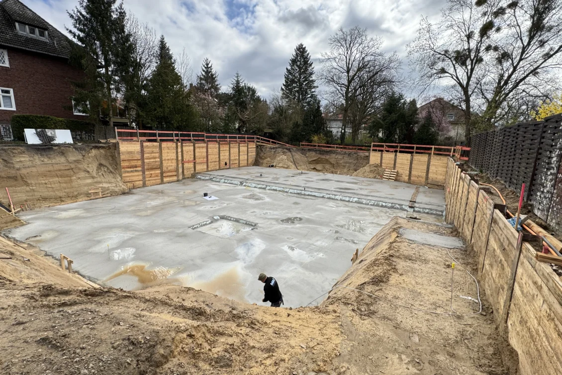 Nach Anbindung der Erdwärmesonden haben wir die Erdarbeiten abgeschlossen. Weiter geht es mit der Herstellung der Sauberkeitsschicht, der Basis für alle weiteren Bauprozesse. Zunächst werden die Stützenfundamente sorgfältig vorbereitet sodass anschließend betoniert werden kann.