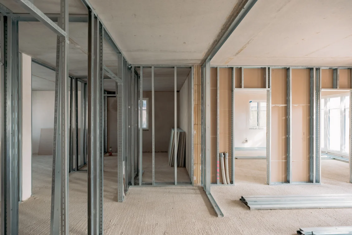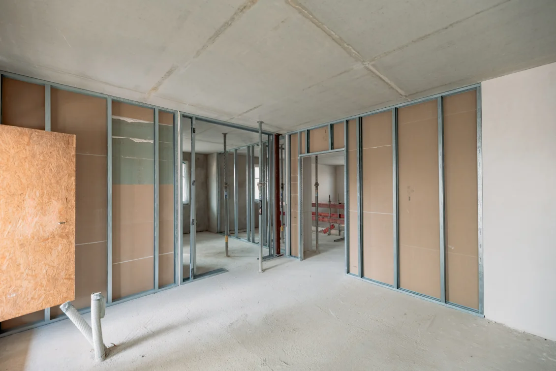 Im Innenbereich wurden die Trockenbauwände gesetzt und die Profile für die Raumaufteilung installiert.