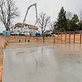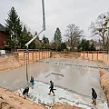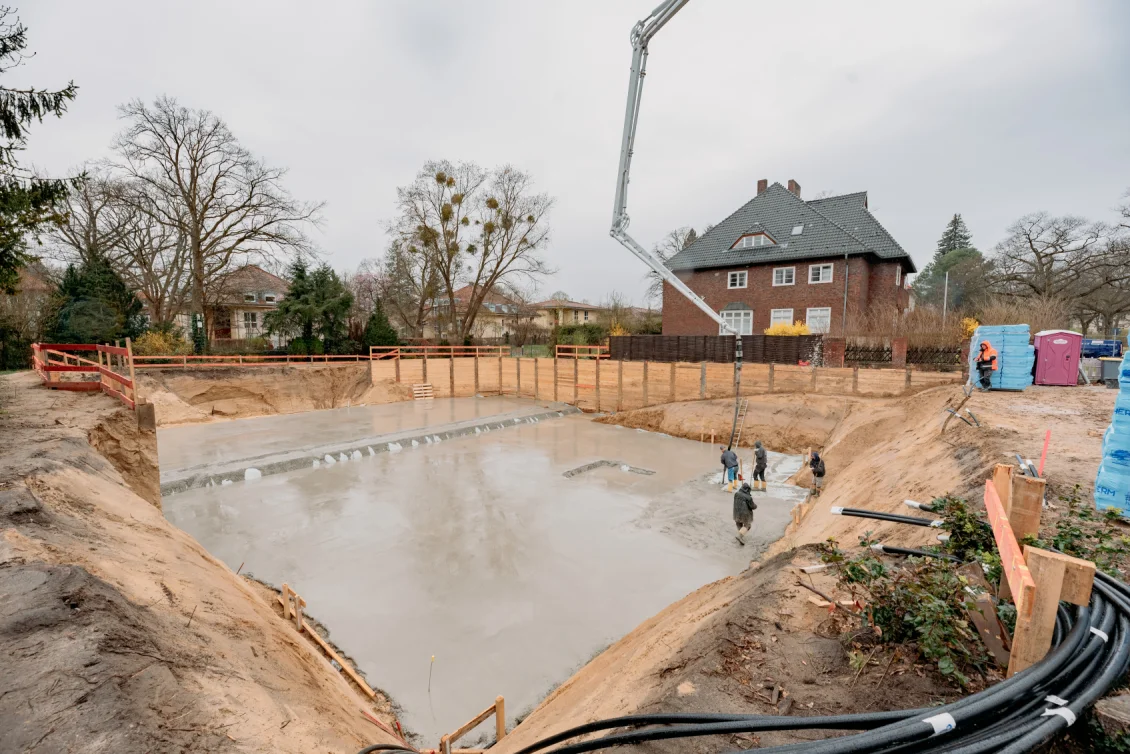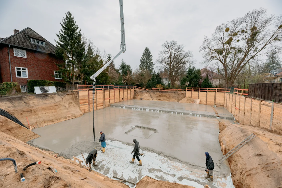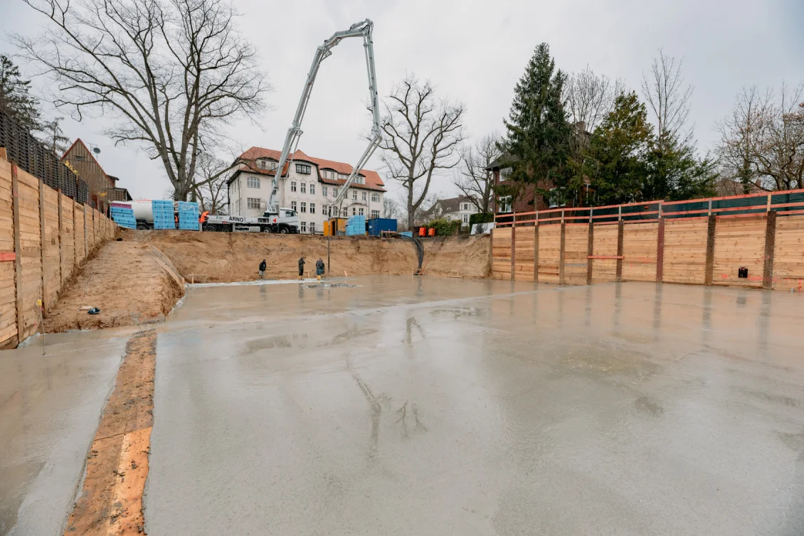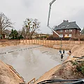 Das Feinplanum der Baugrube wurde mit einer Folie abgedeckt, so dass jetzt mit einer großen Betonpumpe die Sauberkeitsschicht aus Beton gegossen wird. So gewährleisten wir einen guten Untergrund für die Gründungsbauteile des Gebäudes.