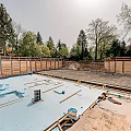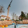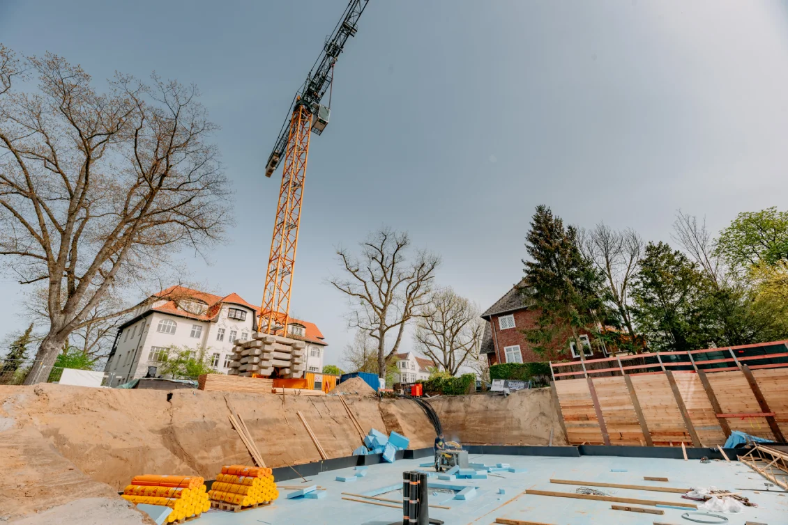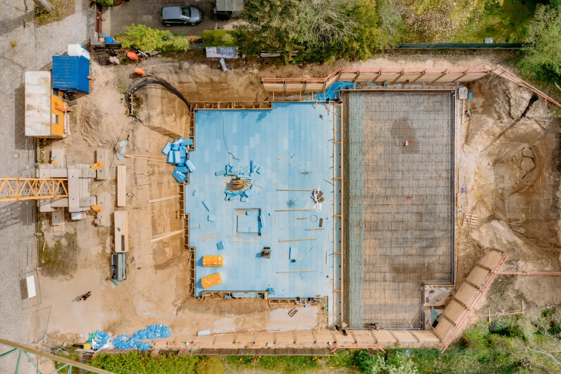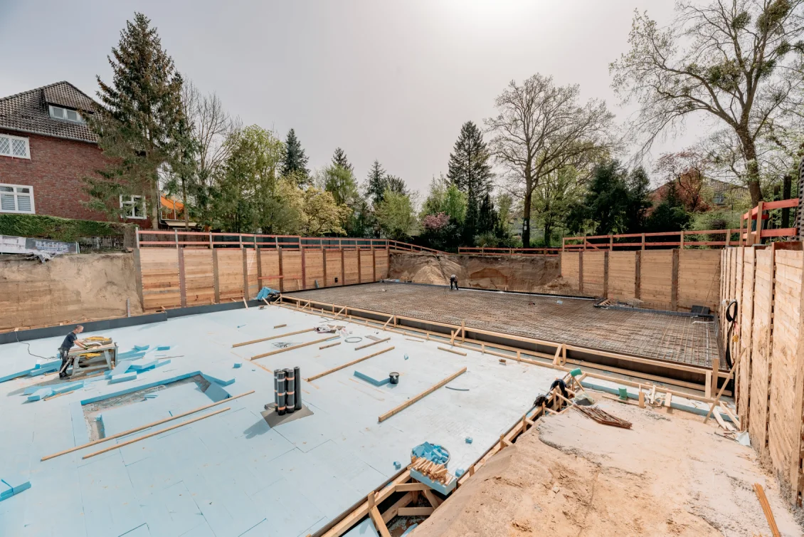 Unser Baukran steht und liefert wertvolle Montagehilfe zur Verlegung des Betonstahls. Im Bereich des Wohngebäudes wird eine druckfeste Dämmung verlegt, so dass später optimaler Wärmeschutz gewährleistet ist.