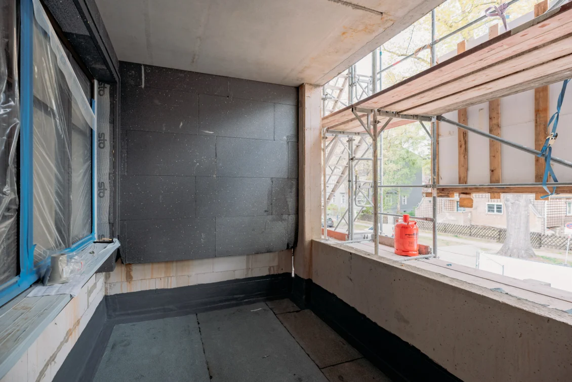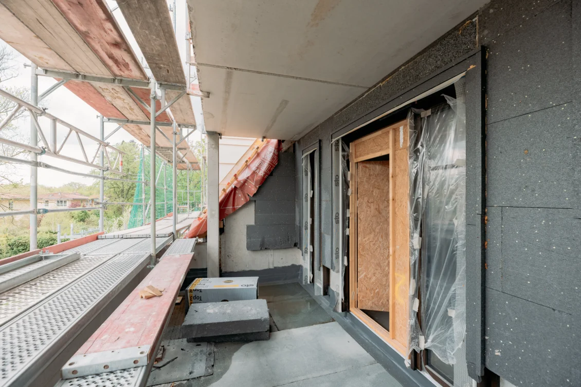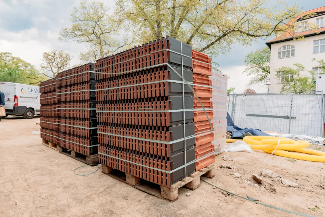 In dieser Woche wurde das Dach weiter vorbereitet: Die Lieferung der Dachziegel ist erfolgt, sodass der Eindeckung nun nichts mehr im Wege steht. Zeitgleich wurden auf der Balkonseite Dämmelemente montiert – sie bilden die Grundlage für die spätere Putzfassade und tragen zur energetischen Optimierung bei.