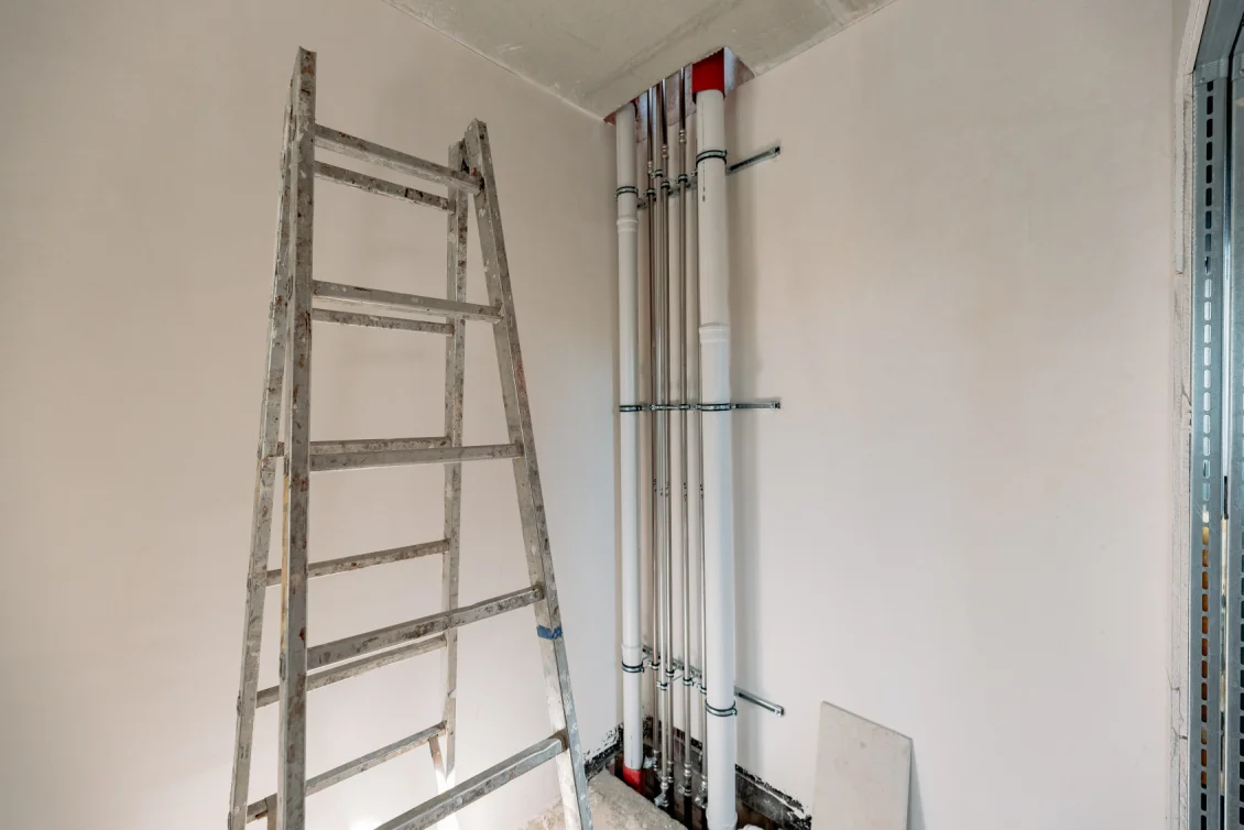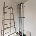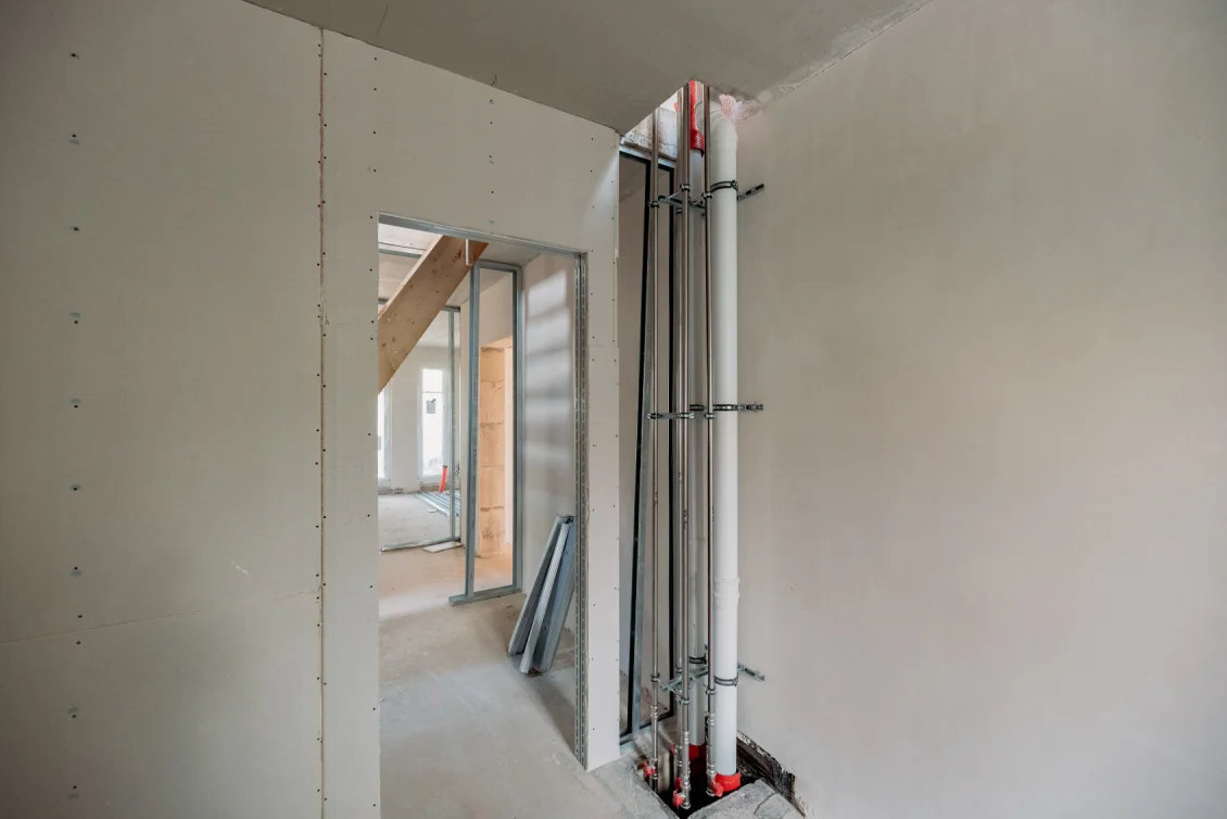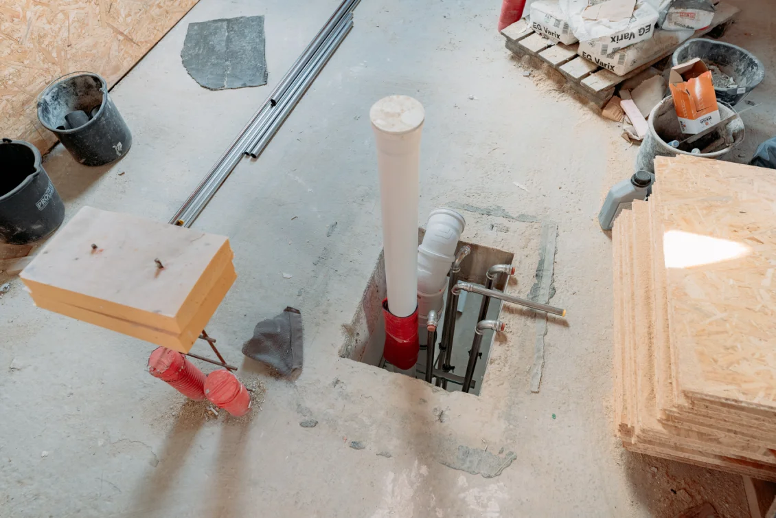 Der Innenausbau schreitet weiter voran: Die Installation der technischen Gebäudeausrüstung (TGA) ist in vollem Gange. Die Leitungen und Rohrsysteme für Heizung, Trinkwasser- und Abwasserinstallation wurden in den vorgesehenen Schächten bereits verlegt bzw. vorbereitet.