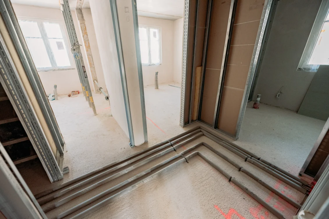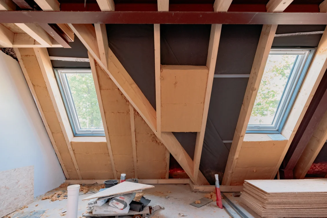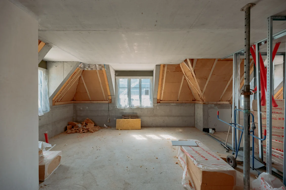 Im Dachgeschoss und Spitzboden wurde in dieser Woche die Zwischensparrendämmung von innen eingebracht. Zum Einsatz kommt eine nachhaltige Holzfaserdämmung, die sowohl eine hohe Wärmedämmleistung als auch effektiven sommerlichen Hitzeschutz bietet. Parallel dazu gehen die Arbeiten im Innenausbau weiter: Die technische Gebäudeausrüstung wird fortlaufend ergänzt und in allen Geschossen installiert.