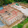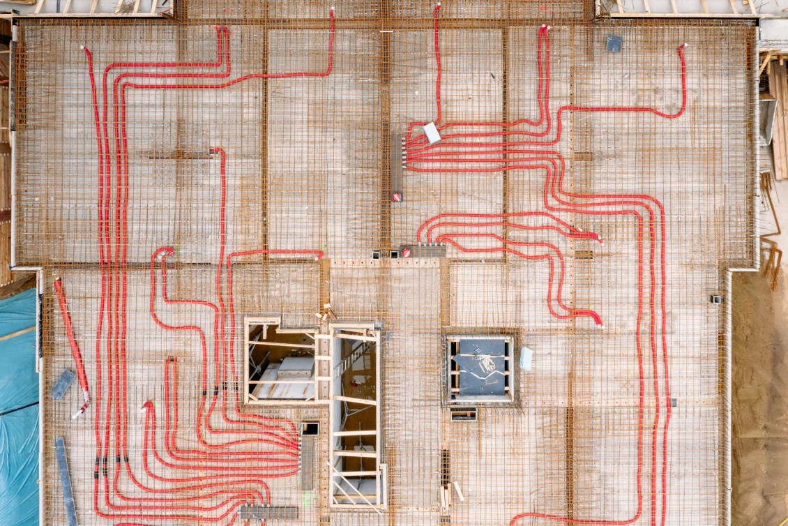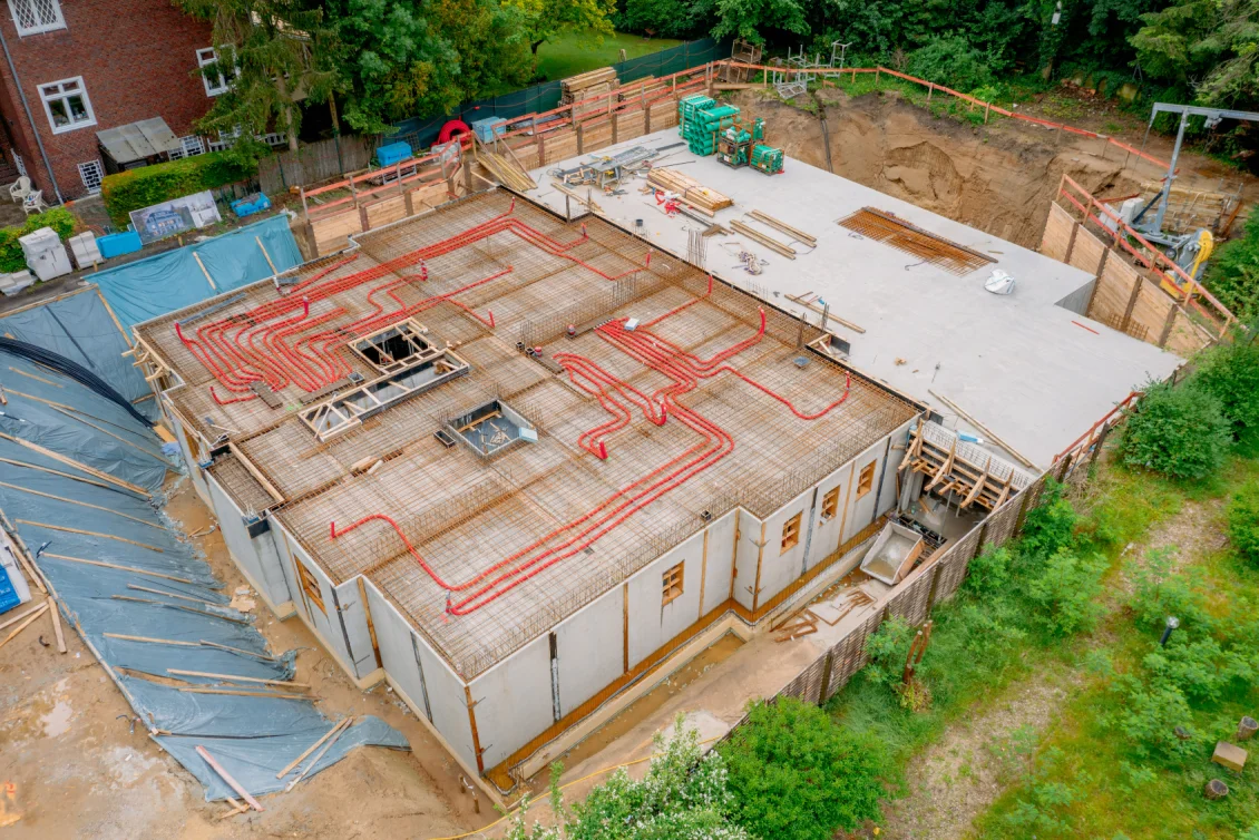 In die Stahlbetondecke werden bereits erste haustechnische Installationen für Lüftung und Abwasser verlegt.