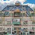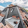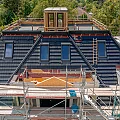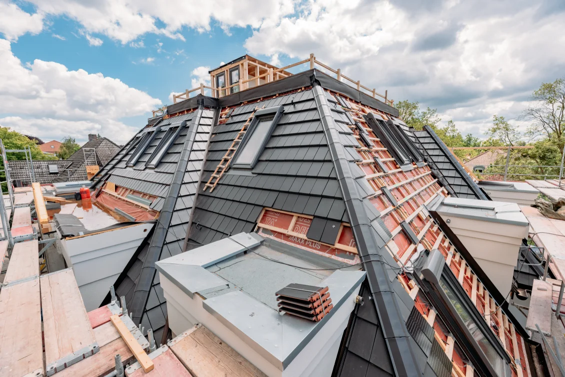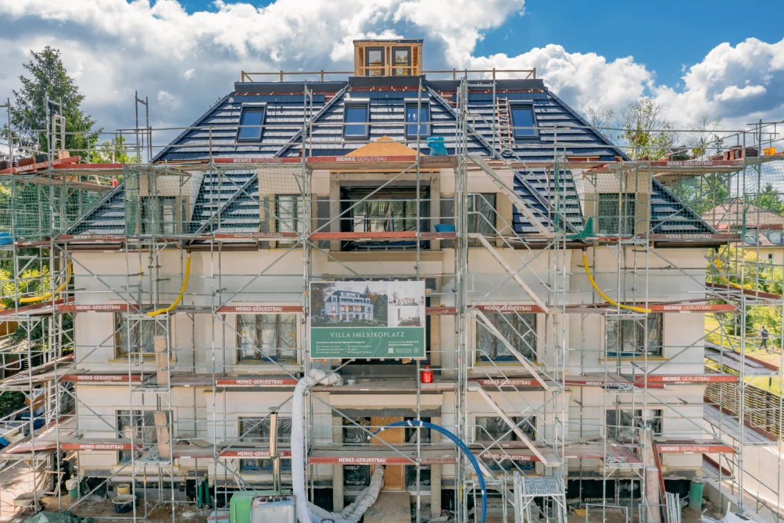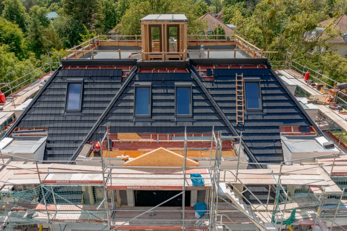 Auf den Dachflächen und zukünftigen Terrassen schreiten die Abdichtungsarbeiten voran – Bitumenbahnen sorgen für den nötigen Witterungsschutz. Auch die Anschlüsse an die Dachfenster wurden sorgfältig abgedichtet. Zeitgleich werden weitere Dachflächen für die Eindeckung vorbereitet und die Fassadengliederung weiter ausgearbeitet.